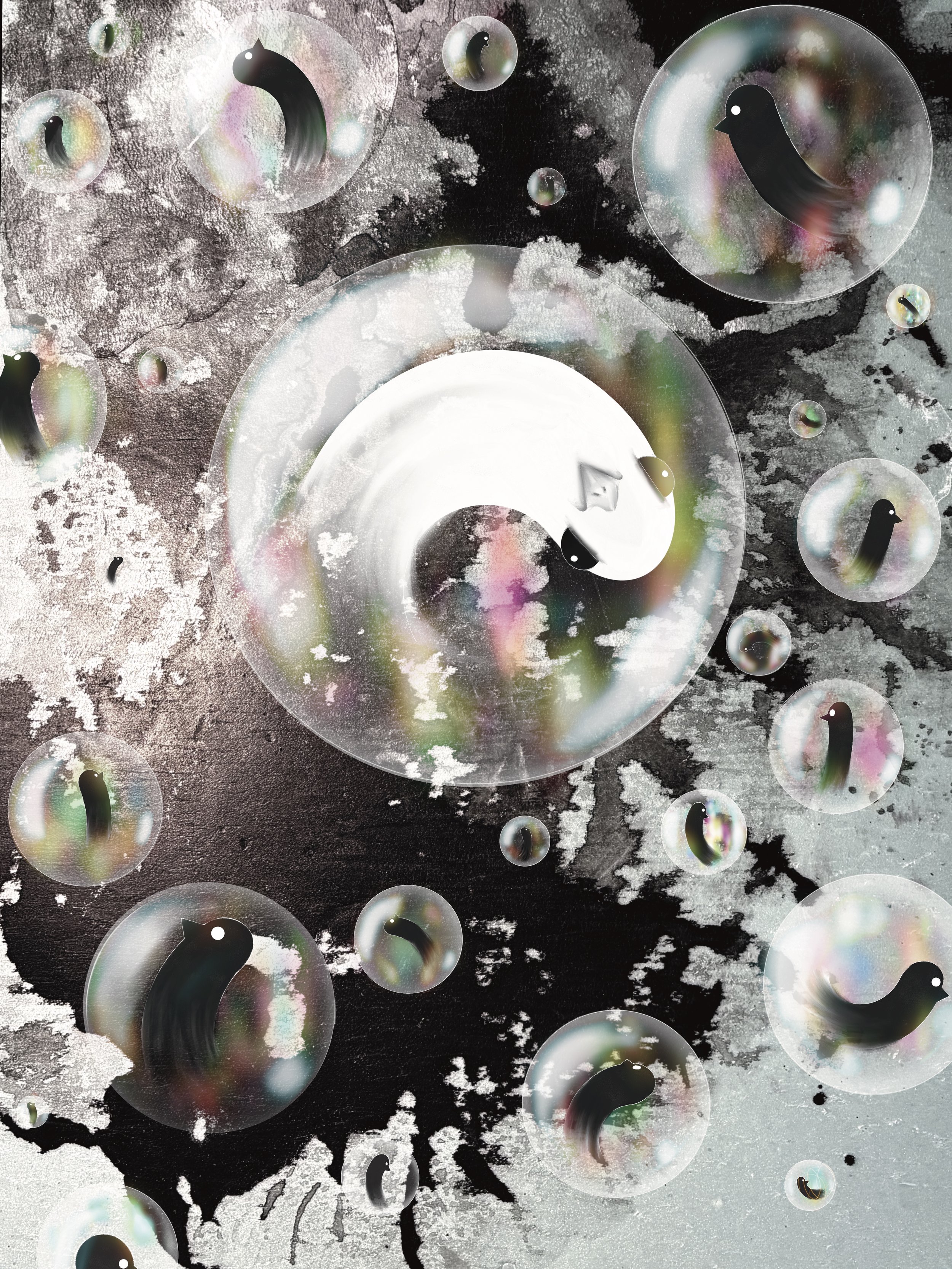 Each figure exists within a translucent membrane: self-contained, luminous, refracted. They float in proximity yet remain untouchable — suspended in a shared field that never fully connects.